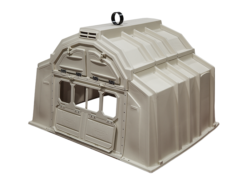 - Maschinelle Reinigung (Machine Ready): Der Bereich vor der Hütte lässt sich komplett öffnen, sodass die Einstreu bequem mit einem Kompakt- oder Hoflader entfernt werden kann.